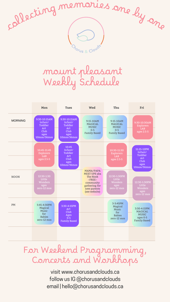 Chorus & Clouds is an early learning studio for infants, toddlers and pre-school aged children to explore the wonder in our world primarily through our live folk music repertoire, expressive arts and play based approach.