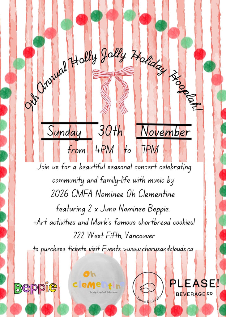 November 30th will mark our 9th annual Holly Jolly Holiday Hooplah. A chance for families to have fun and celebrate the love of music, art and more than anything to get a chance to be in community together. I have always cherished these end of year parties and know you will with our special guest !